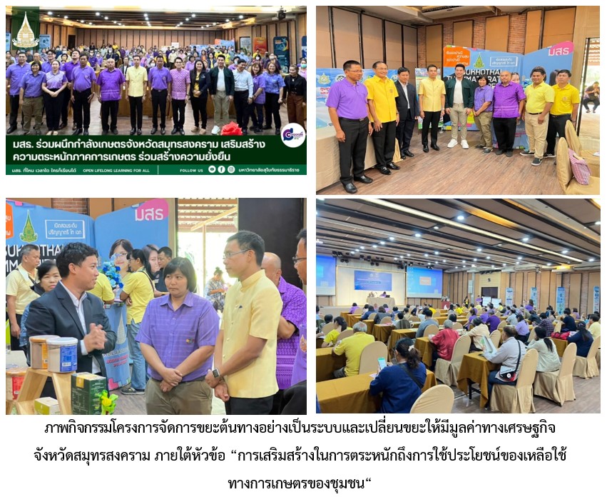 มหาวิทยาลัยสุโขทัยธรรมาธิราช (มสธ.) โดยสาขาวิชาเกษตรศาสตร์และสหกรณ์ร่วมกับสำนักงานจังหวัดสมุทรสงครามโดยสำนักงานทรัพยากรธรรมชาติและสิ่งแวดล้อม จัดโครงการจัดการขยะต้นทางอย่างเป็นระบบและเปลี่ยนขยะให้มีมูลค่าทางเศรษฐกิจจังหวัดสมุทรสงคราม ภายใต้หัวข้อ “การเสริมสร้างในการตระหนักถึงการใช้ประโยชน์ของเหลือใช้ทางการเกษตรของชุมชน“ เมื่อวันที่ 19 กุมภาพันธ์ 2567 ณ กนกรัตน์ รีสอร์ท