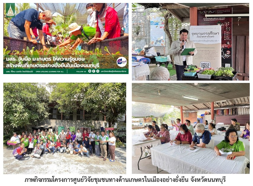 มหาวิทยาลัยสุโขทัยธรรมาธิราช (มสธ.) โดยสถานอุทยานการศึกษารัชมังคลาภิเษกและสาขาวิชาเกษตรศาสตร์และสหกรณ์ ร่วมกับมหาวิทยาลัยเกษตรศาสตร์ จัด “โครงการศูนย์วิจัยชุมชนทางด้านเกษตรในเมืองอย่างยั่งยืน จังหวัดนนทบุรี” โดยพิธีเปิดมีขึ้น เมื่อวันที่ 4 กุมภาพันธ์ 2568 ณ สวนเกษตรลัดดาวัลย์ มี ผศ.ดร.กรรณ จรรยาวุฒิวรรณ์ รักษาการแทนรองอธิการบดีฝ่ายบริการวิชาการ ทำนุบำรุงศิลปวัฒนธรรม และวิเทศสัมพันธ์ เป็นประธานในพิธี โครงการมีการจัดอบรมและฝึกปฏิบัติเรื่องการออกแบบพื้นที่เกษตรในเมือง และการปลูกผักสลัด ให้แก่เกษตรกร ซึ่งมีผู้สนใจเข้าร่วมโครงการจำนวน 60 คน ในส่วนของ มสธ. มี ผศ.ดร.ปริชาติ ดิษฐกิจ ผอ.สถานอุทยานการศึกษารัชมังคลาภิเษก และเป็นอาจารย์ประจำสาขาวิชาเกษตรศาสตร์และสหกรณ์ เป็นผู้นำโครงการ (https://news.stou.ac.th/2024/02/12/670204/)