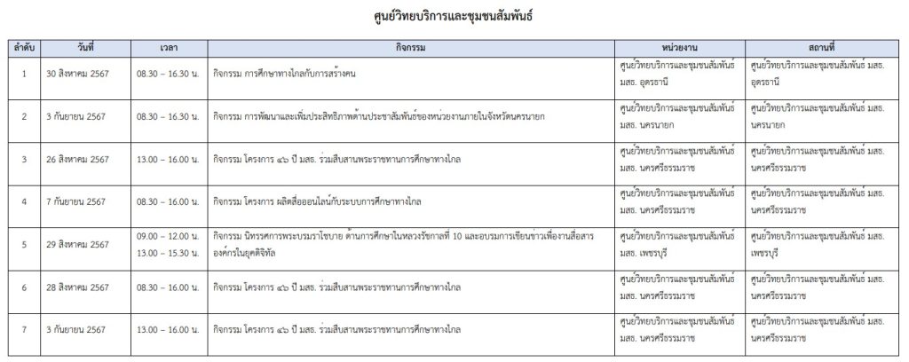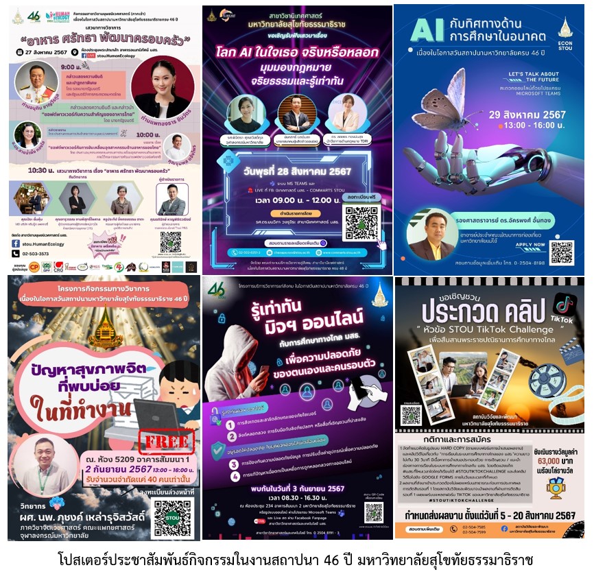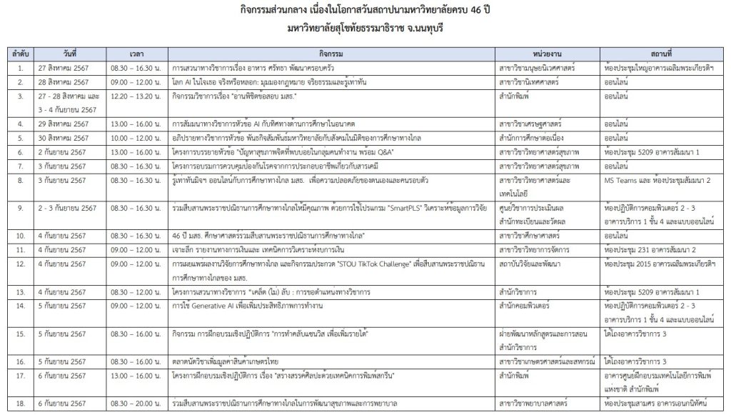 ผลการดำเนินงาน SDG4.3.2 โครงการกิจกรรมทางวิชาการ เนื่องในโอกาสวันสถาปนามหาวิทยาลัยครบ 46 ปี มหาวิทยาลัยสุโขทัยธรรมาธิราช โดยสำนักวิชาการดำเนินโครงการกิจกรรมทางวิชาการ เนื่องในโอกาสวันสถาปนามหาวิทยาลัยครบ 46 ปี ระหว่างวันที่ 26 สิงหาคม – 7 กันยายน 2567 ในลักษณะจัดกิจกรรมแบบผสมผสานระหว่างแบบเผชิญหน้ากับแบบออนไลน์ ประกอบกับมหาวิทยาลัยได้มีกำหนดแนวคิดการจัดกิจกรรม “46 ปี มสธ. ร่วมสืบสานพระราชปณิธานการศึกษาทางไกล” โดยสาขาวิชาและหน่วยงานได้ร่วมจัดกิจกรรม จำนวน 25 โครงการ/กิจกรรม เช่น การอภิปรายการบรรยาย การประชุม การสัมมนา การเสวนาทางวิชาการ การฝึกอบรม เป็นต้น โดยมีผู้เข้าร่วมกิจกรรมประกอบด้วยบุคลากรมหาวิทยาลัยและประชาชนทั่วไป