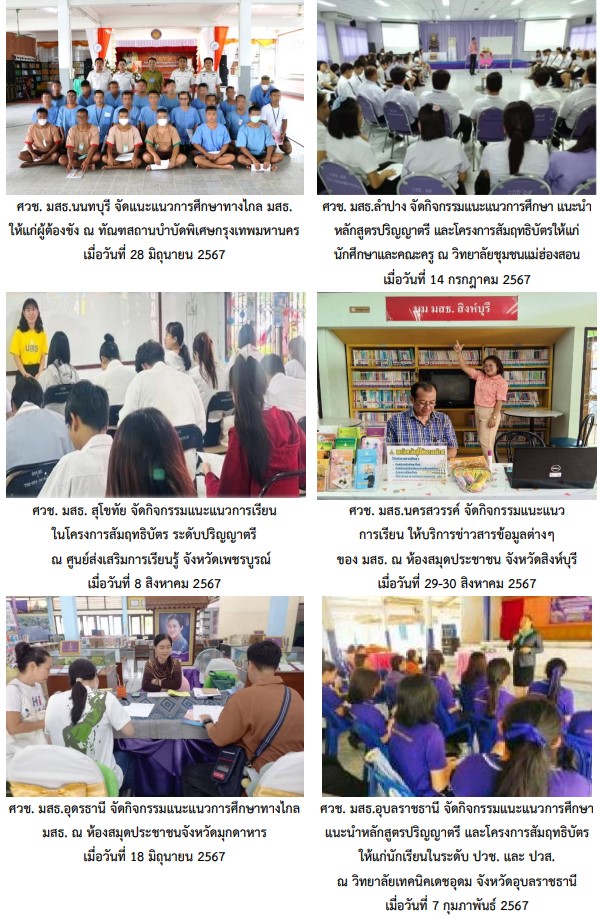 มหาวิทยาลัยสุโขทัยธรรมาธิราช มีศูนย์วิทยบริการและชุมชนสัมพันธ์ มสธ. จำนวน 12 แห่งทั่วประเทศ ได้แก่ นนทบุรี ลำปาง สุโขทัย นครสวรรค์ อุดรธานี อุบลราชธานี นครนายก เพชรบุรี จันทบุรี นครศรีธรรมราช ยะลา และกาญจนบุรี ซึ่งจัดตั้งอยู่ในส่วนภูมิภาค เพื่อให้บริการสื่อการศึกษาและบริการข่าวสารข้อมูลต่างๆ ของมหาวิทยาลัยแก่นักเรียน นักศึกษา เยาวชนในสถานพินิจและคุ้มครองเด็กและเยาวชน ผู้ต้องขังในเรือนจำ และผู้สนใจใฝ่รู้ โดยจัดกิจกรรมบรรยายแนะนำมหาวิทยาลัย การจัดการเรียนการสอน และหลักสูตรต่างๆ พร้อมทั้งแนะแนวการศึกษาต่อระดับอุดมศึกษา ประชาสัมพันธ์หลักสูตรต่างๆ ของมหาวิทยาลัย โดยมีวัตถุประสงค์ของกิจกรรมเพื่อเป็นการขยายและกระจายโอกาสทางการศึกษาระดับอุดมศึกษาให้กว้างขวางยิ่งขึ้นตามปณิธานของมหาวิทยาลัย และเพื่อช่วยพัฒนาคุณภาพชีวิต ความรู้ ความสามารถ และโอกาสในการนำไปประกอบอาชีพ และดำเนินชีวิตภายหลังพ้นโทษสำหรับผู้ต้องขัง เช่น