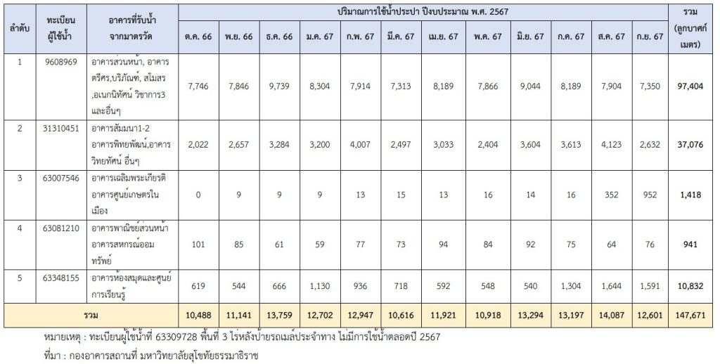 มหาวิทยาลัยสุโขทัยธรรมาธิราชมีปริมาณการใช้น้ำโดยรวมในมหาวิทยาลัย ซึ่งเป็นน้ำที่นำมาจากระบบประปาหลัก ของมหาวิทยาลัยสุโขทัยธรรมธิราช ในปีงบประมาณ พ.ศ. 2567 ตั้งแต่เดือนตุลาคม 2566 ถึงเดือนกันยายน 2567 จำนวนรวม 147,671 ลูกบาศก์เมตร โดยมีรายละเอียดดังนี้นี