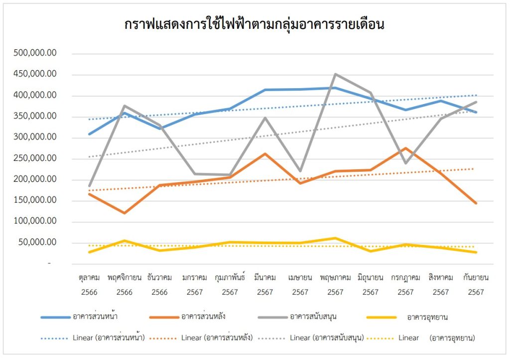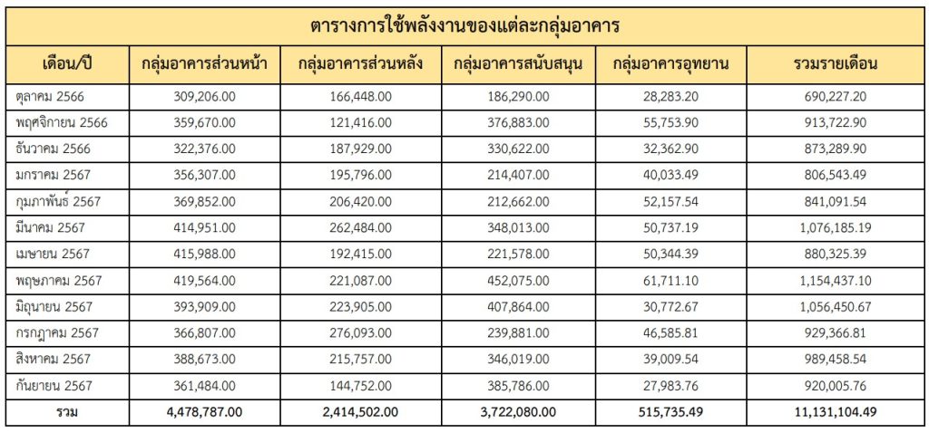 ผลการดำเนินงาน SDG7.2.5 ข้อมูลการใช้พลังงานของปีงบประมาณ พ.ศ. 2567 ซึ่งมหาวิทยาลัยสุโขทัยธรรมาธิราช มหาวิทยาลัยสุโขทัยธรรมาธิราช โดยกองอาคารสถานที่ มีการรวบรวมฐานข้อมูลการใช้พลังงานของปีงบประมาณ พ.ศ. 2567 ซึ่งมหาวิทยาลัยสุโขทัยธรรมาธิราชมีการใช้พลังงานทั้งหมด 11,131,104.49 kWh/ปี (รายละเอียดตามตาราง) สำหรับการตรวจสอบการสูญเสียพลังงาน ปัจจุบันยังอยู่ระหว่างการเปิดใช้อาคารใหม่ คือ อาคารห้องสมุดและศูนย์การเรียนรู้ ทำให้ยังไม่สามารถตรวจสอบการสูญเสียพลังงานโดยเปล่าประโยชน์ที่ชัดเจนได้